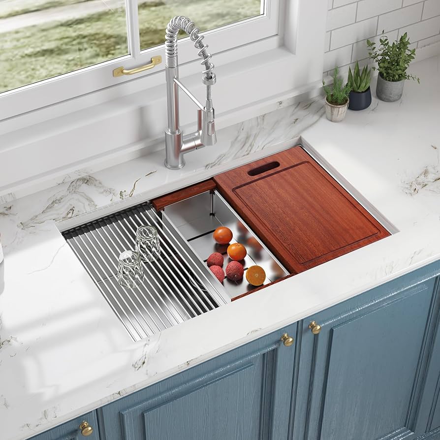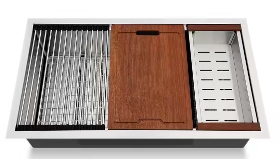 Premium Accessories Custom-Fit Cutting Board: Slides over the sink, allowing you to chop and sweep waste directly into the bowl or disposal. Roll-Up Dish Drying Rack: Perfect for air-drying dishes or rinsing produce right over the sink, then rolls up for easy storage. Stainless Steel Colander/Bowl: Slides on the ledge for rinsing fruits/vegetables or straining pasta. Protective Bottom Grid: Sits at the bottom of the sink to protect the surface from scratches and ensure smooth drainage.